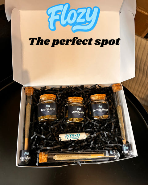 La box Flozy a été pensée pour vous permettre de découvrir nos trois variétés, à travers de belles fleurs et trois pré-rolls soigneusement préparés.